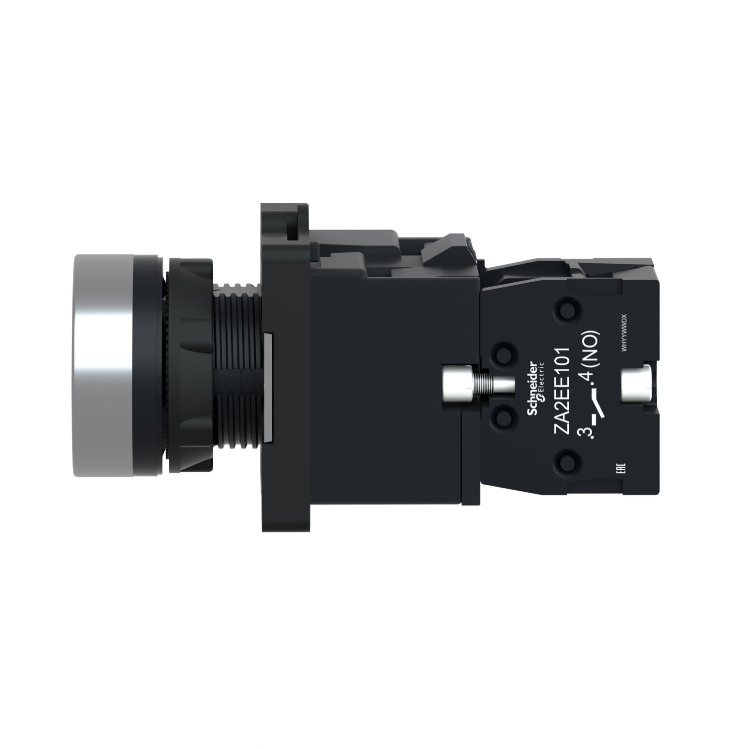 The Schneider XA2EW33M1 is a flush-mount push-button with a diameter of Ø22. It is designed for 220V AC power supply and features 1 normally open (NO) contact.
